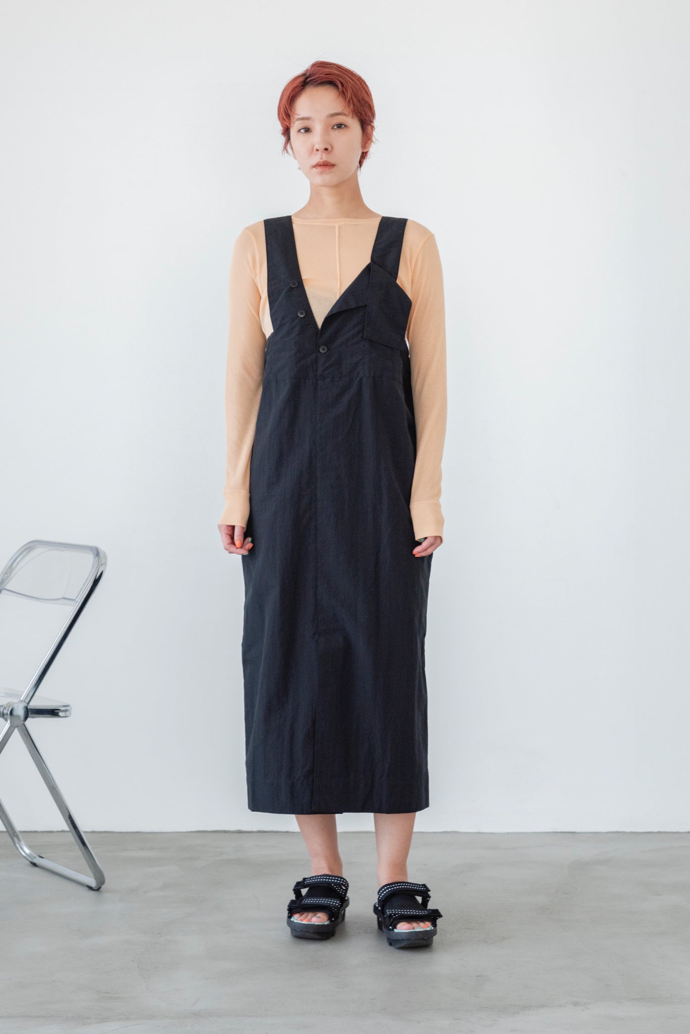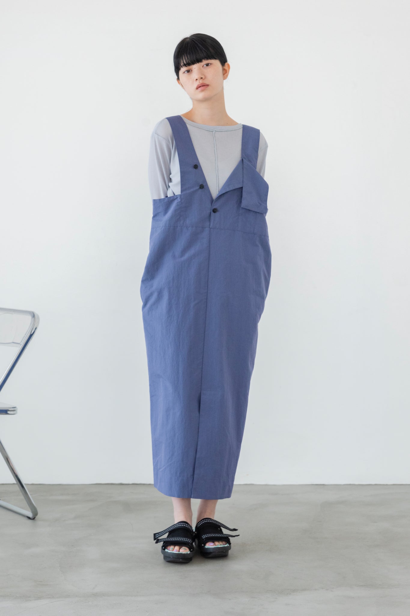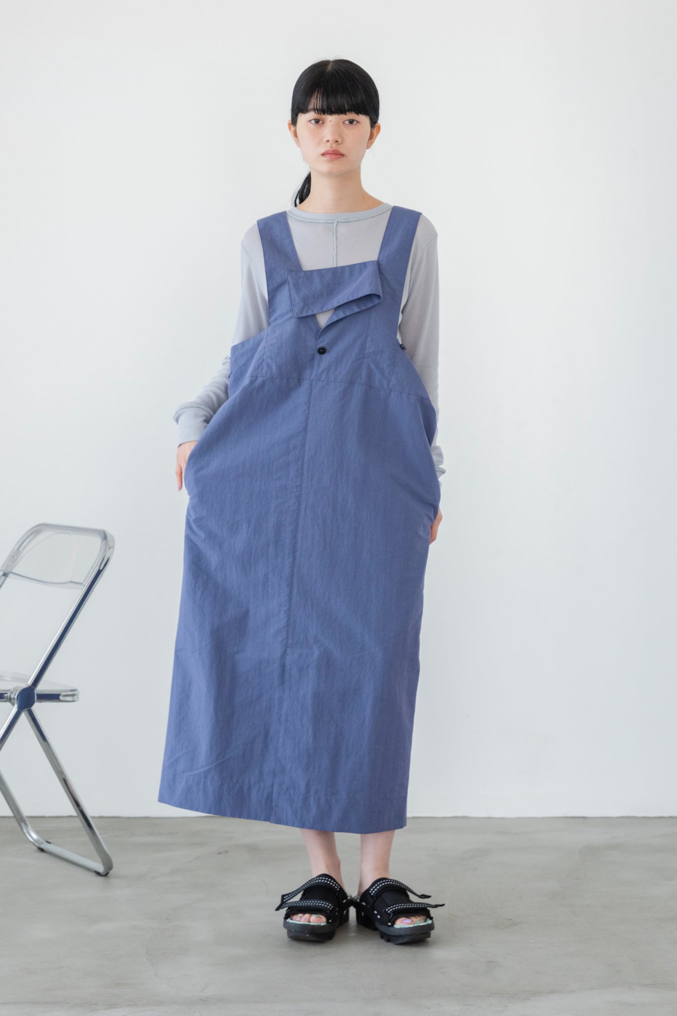 フロントのスリットとベルトのディティールが作るジグザグなフォルムがポイントのジャンパースカート。ベルトは二通りにたためて、印象を変えられます。