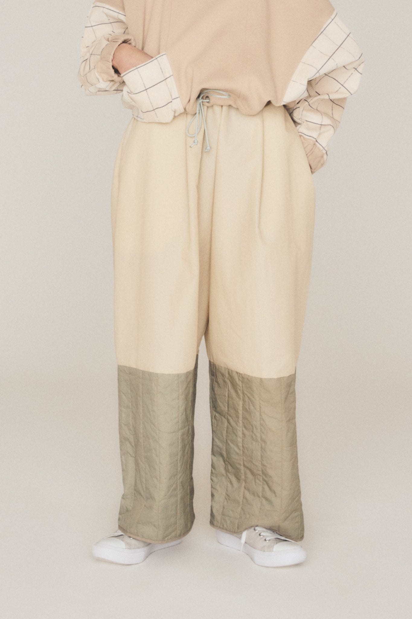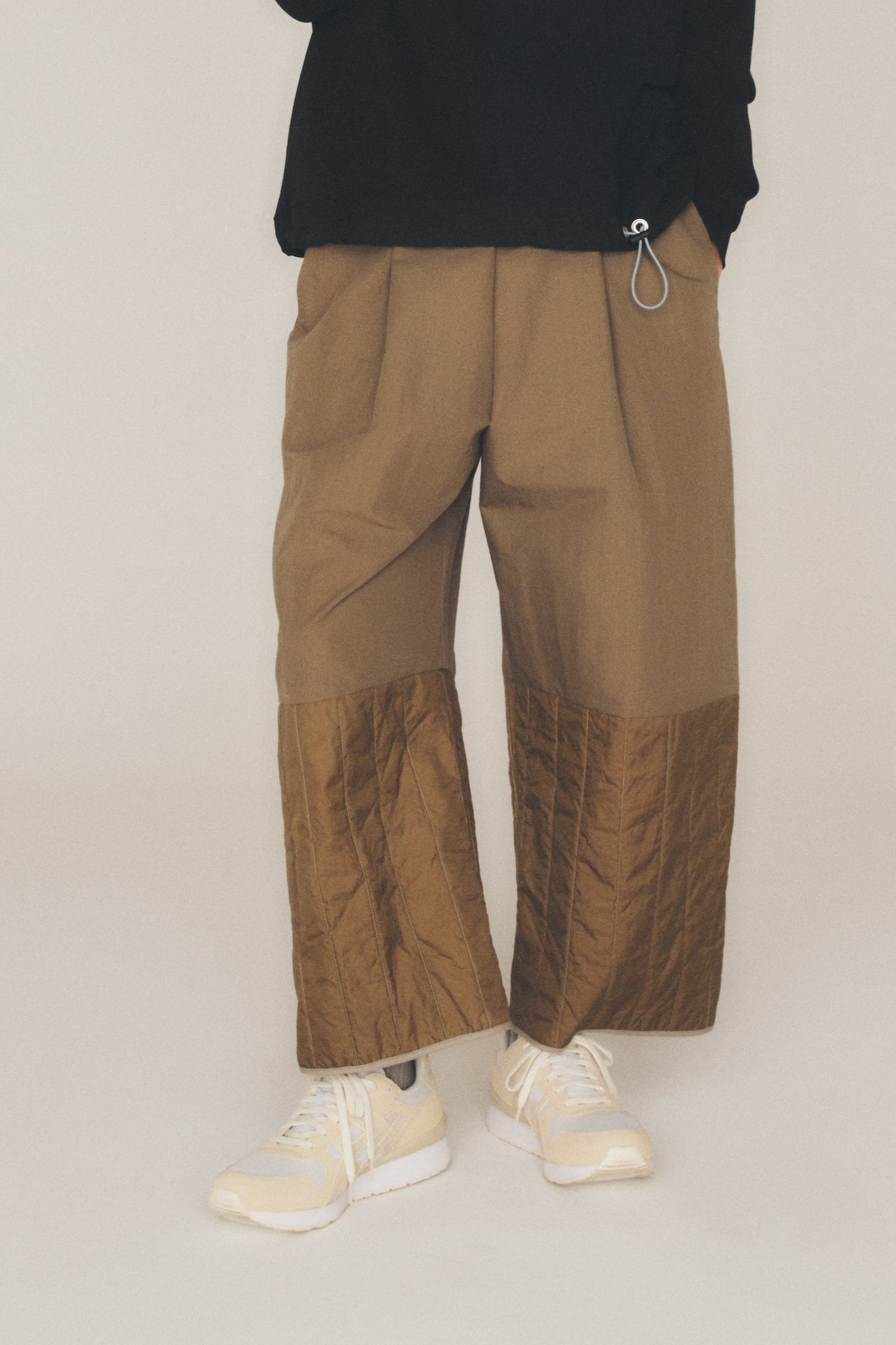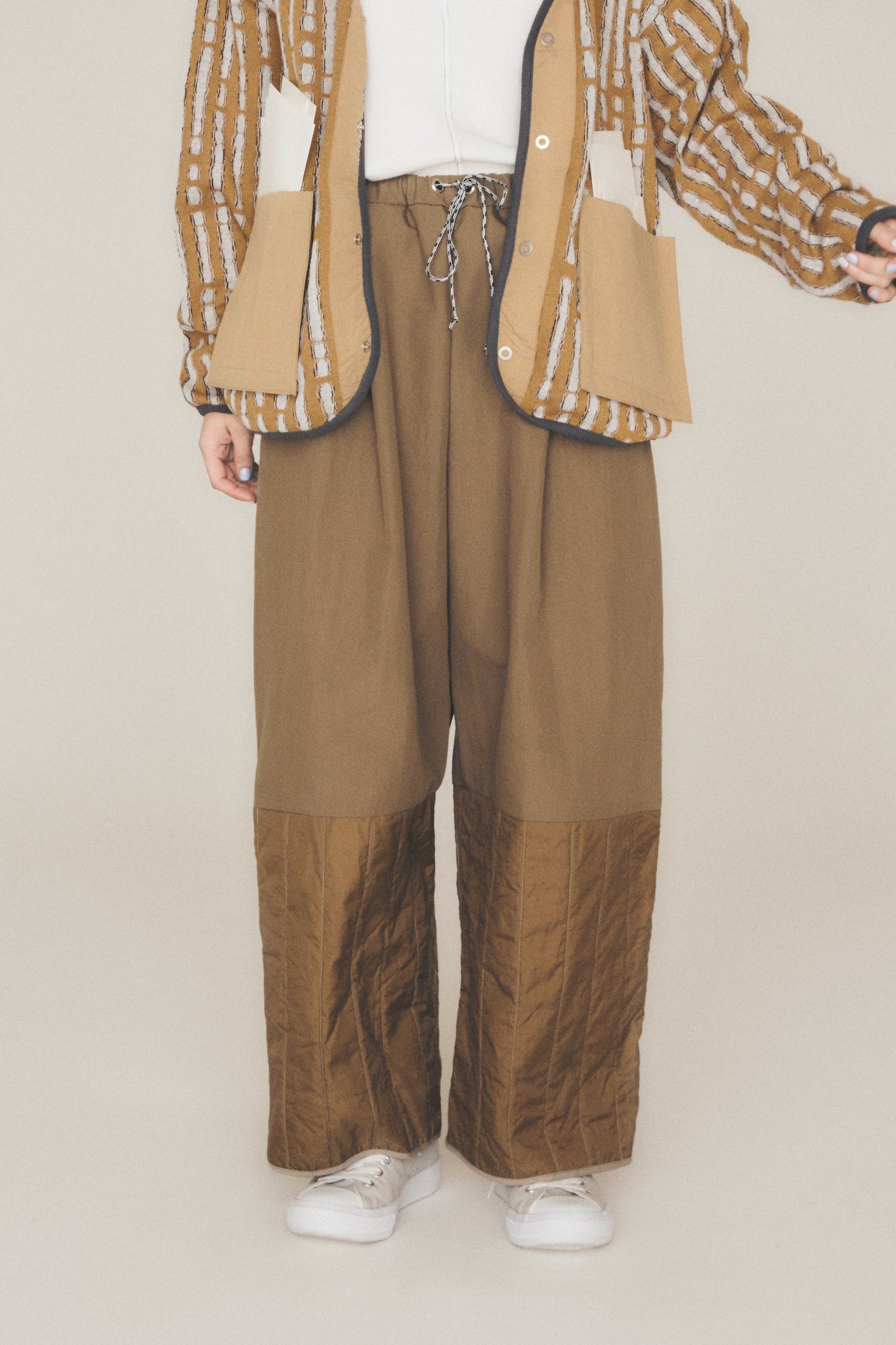 東炊きという江戸時代の染色方法を現代で再現した小さい釜を使って生地を柔らかく染め上げる手法で染められたオリジナルのキルティング生地を裾に使ったワイドパンツ。