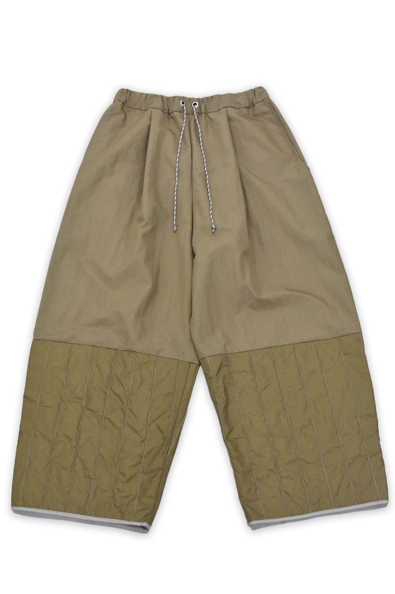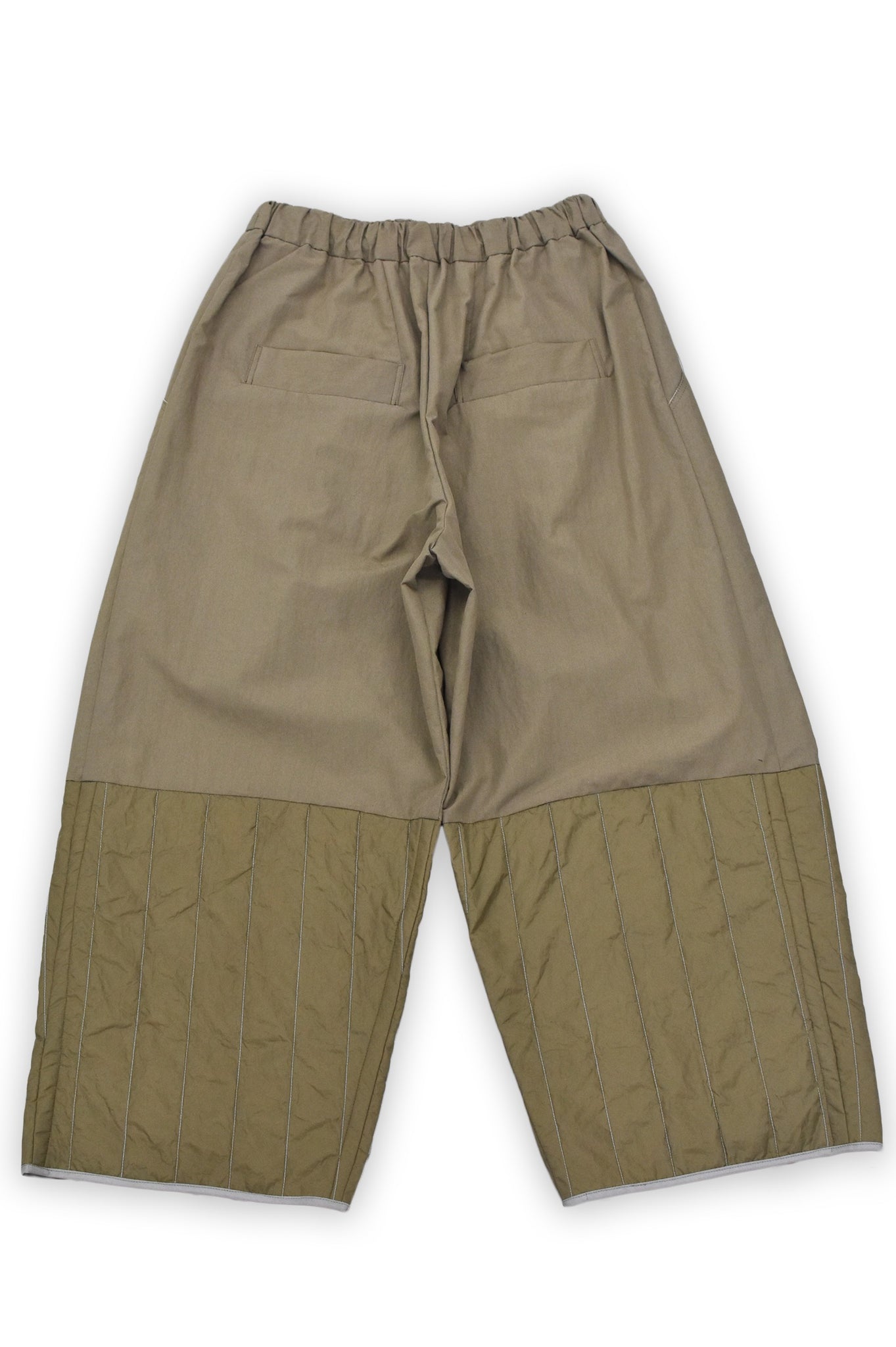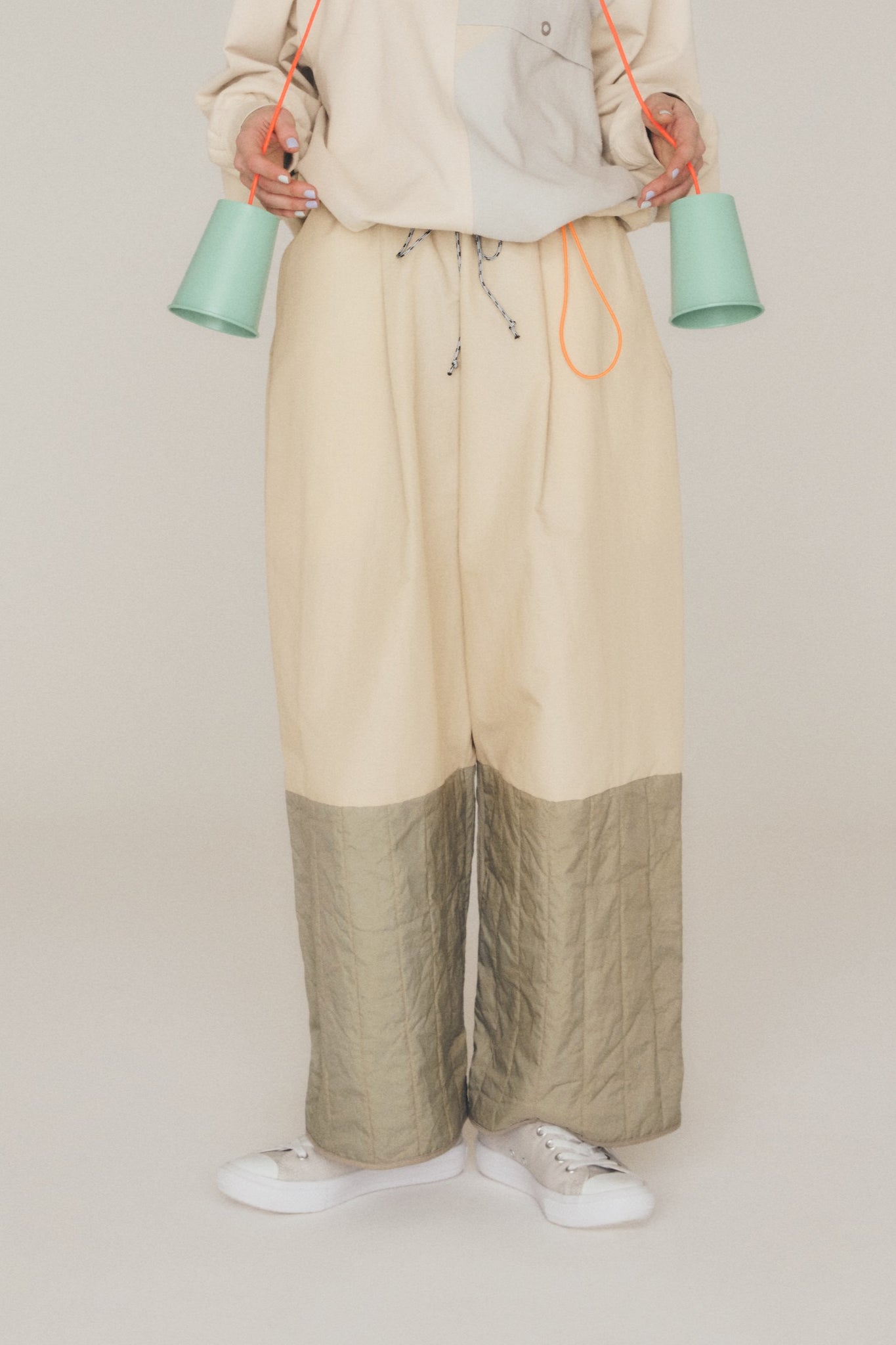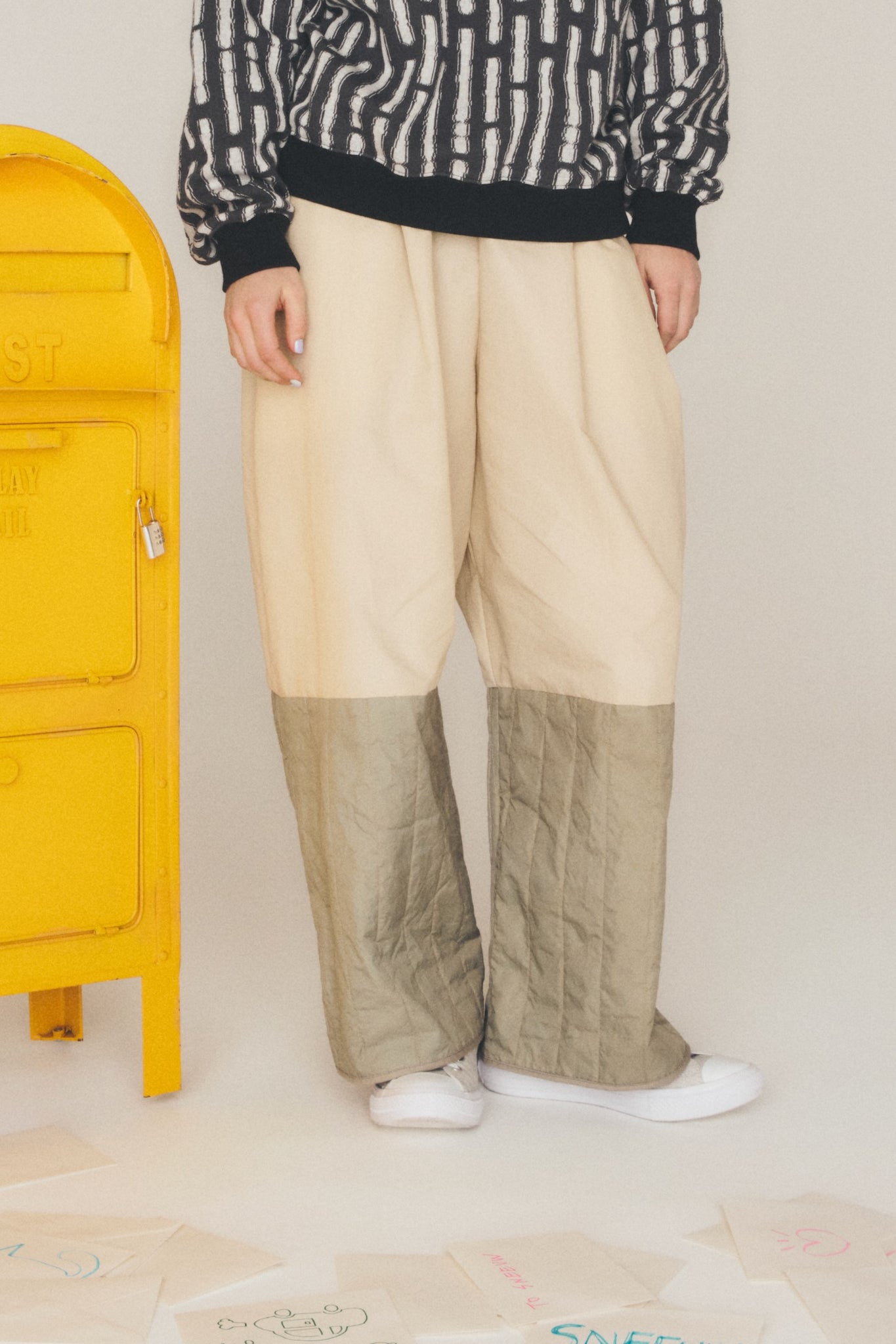 東炊きという江戸時代の染色方法を現代で再現した小さい釜を使って生地を柔らかく染め上げる手法で染められたオリジナルのキルティング生地を裾に使ったワイドパンツ。