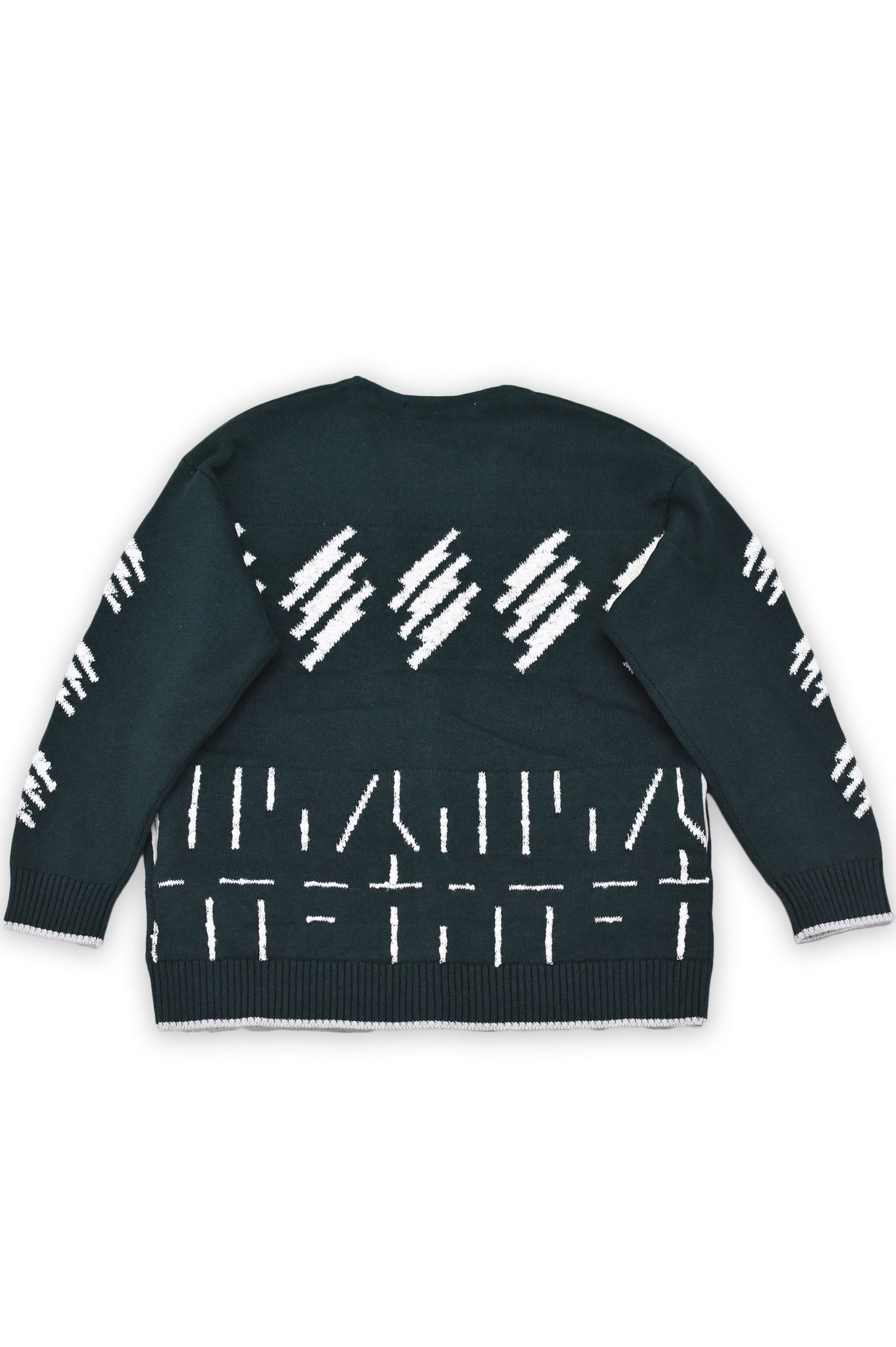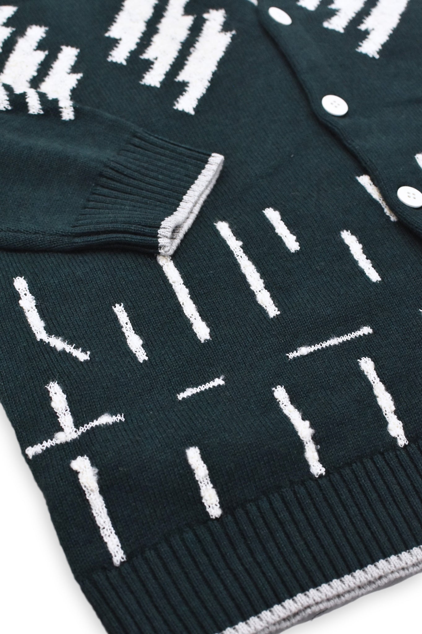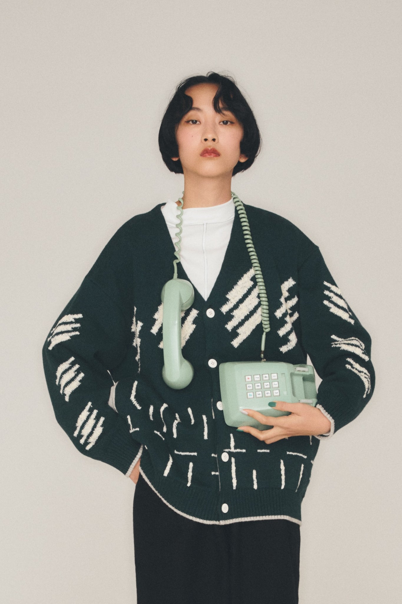 電子回路をイメージしたモチーフが散りばめられたおおぶりなニットカーディガン。