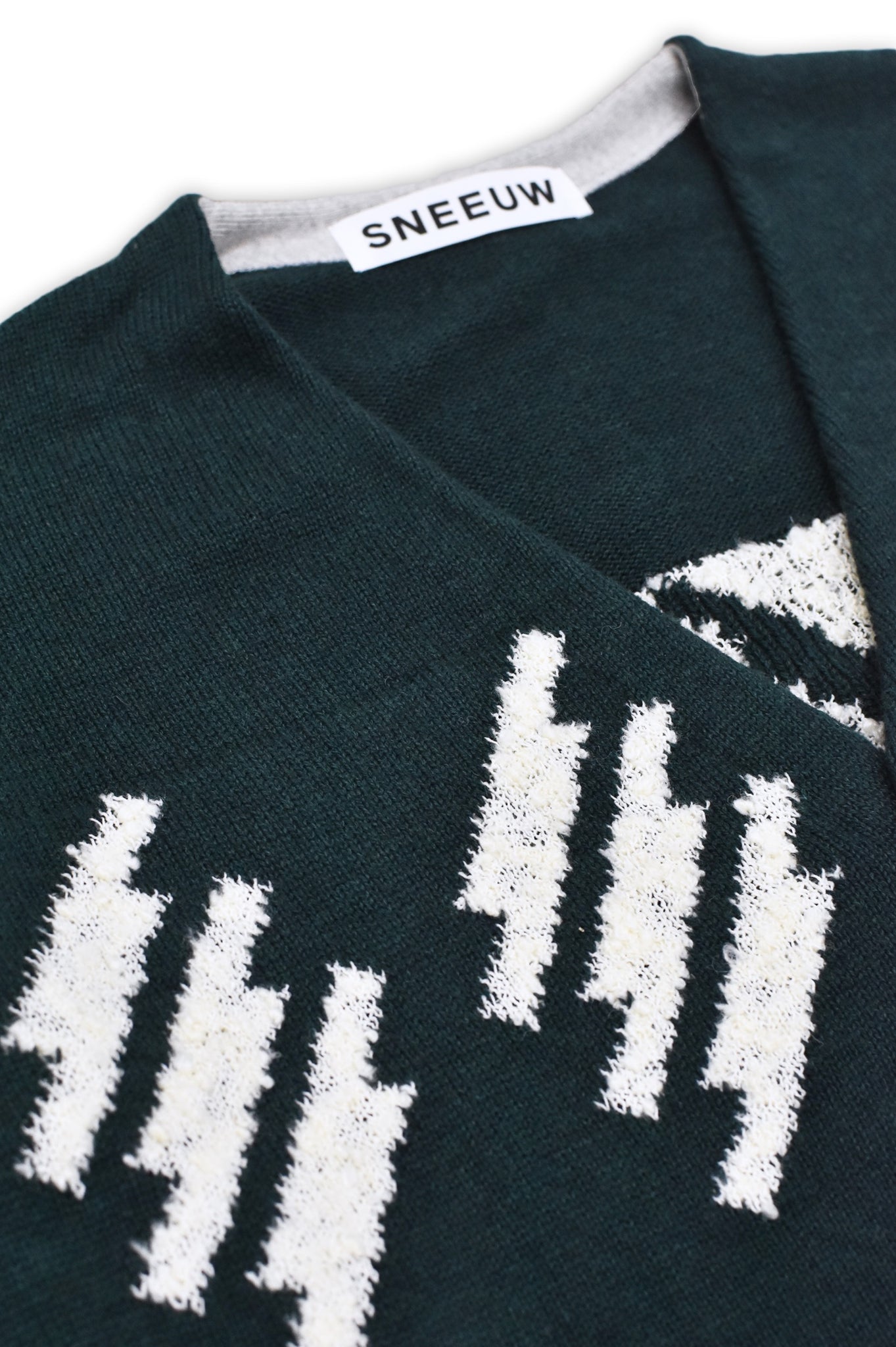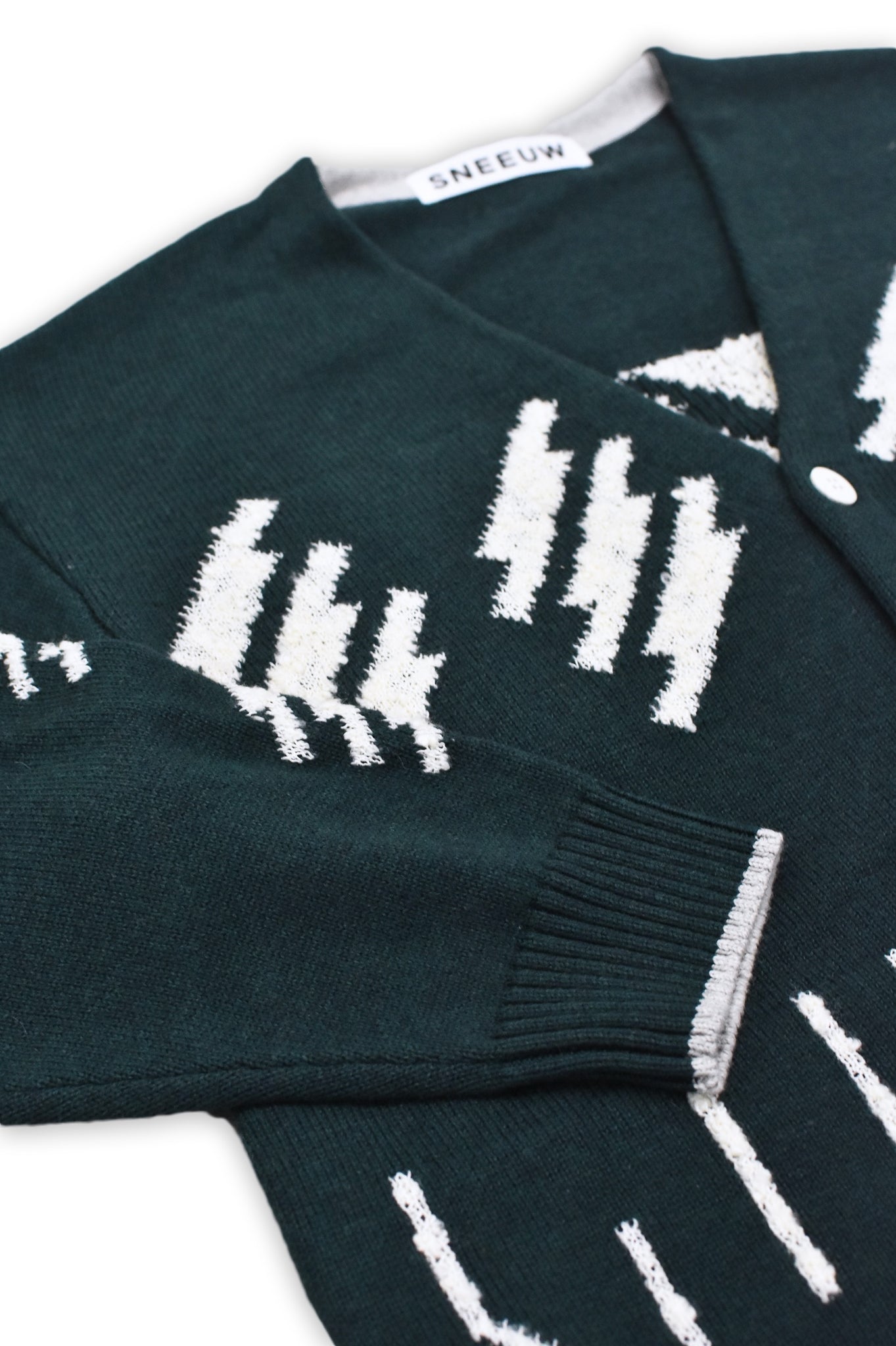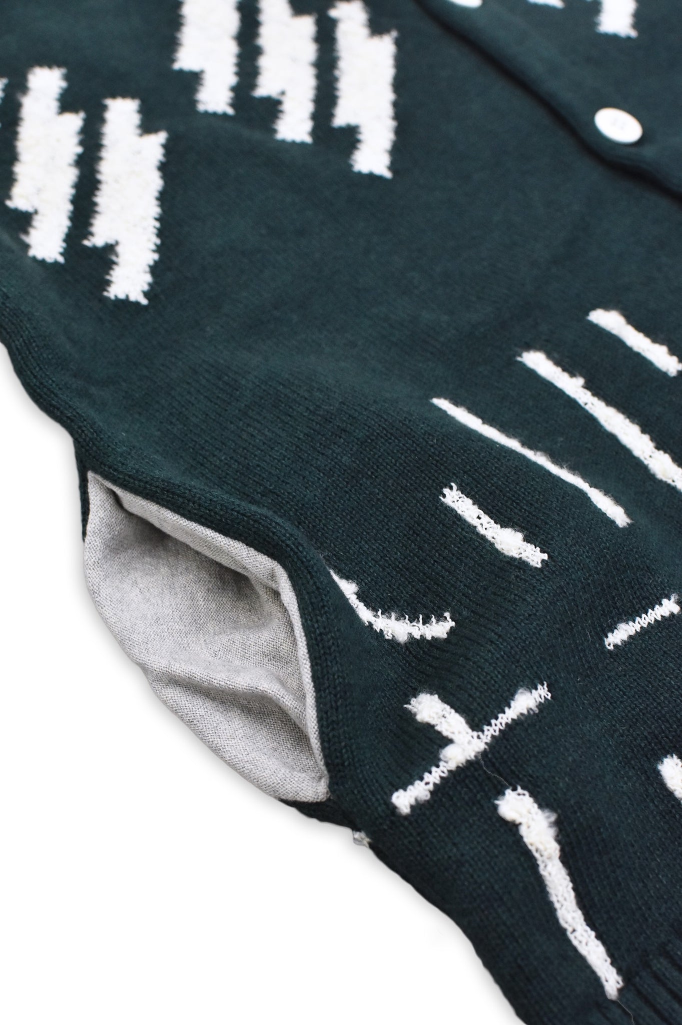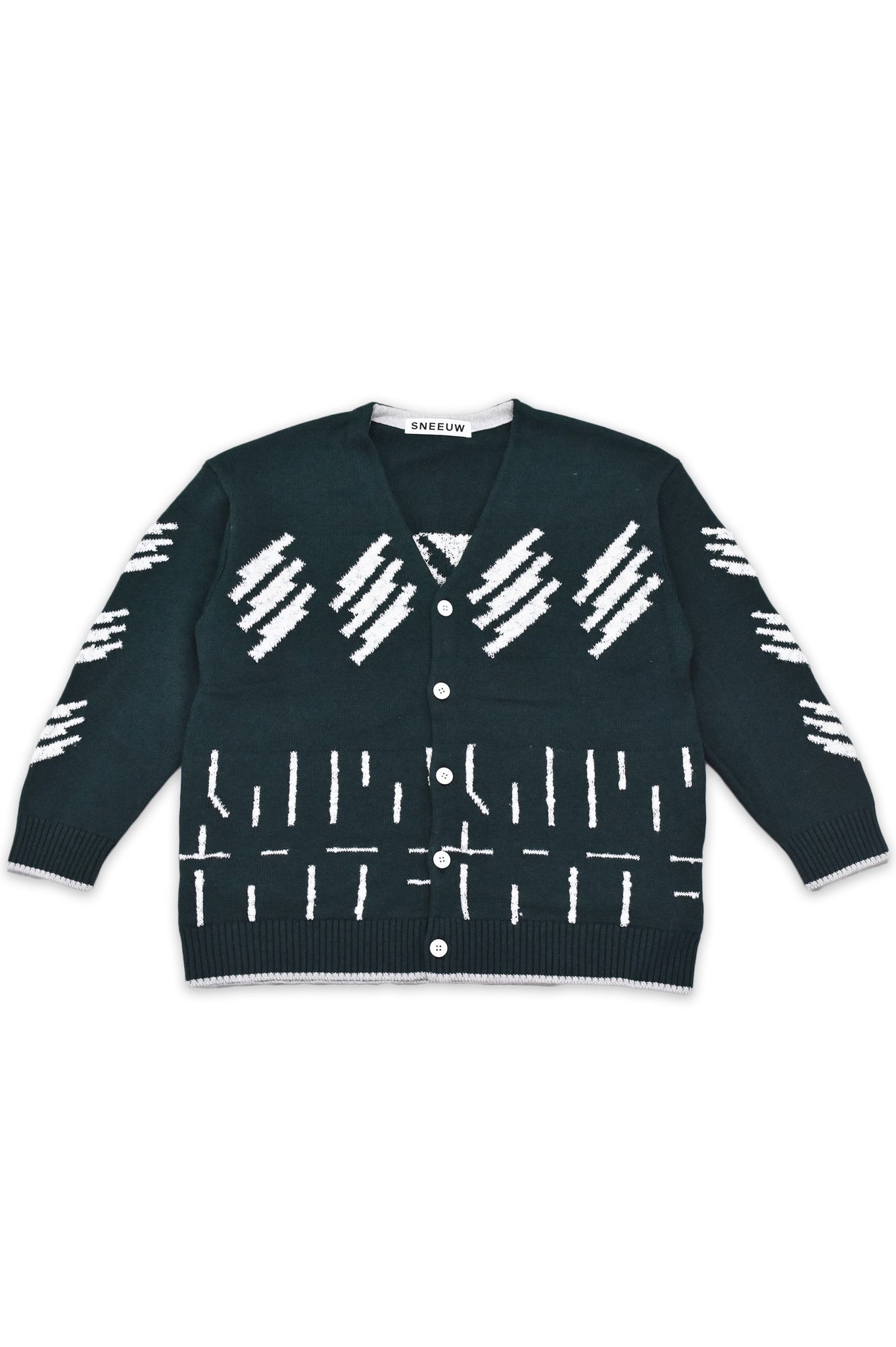 電子回路をイメージしたモチーフが散りばめられたおおぶりなニットカーディガン。