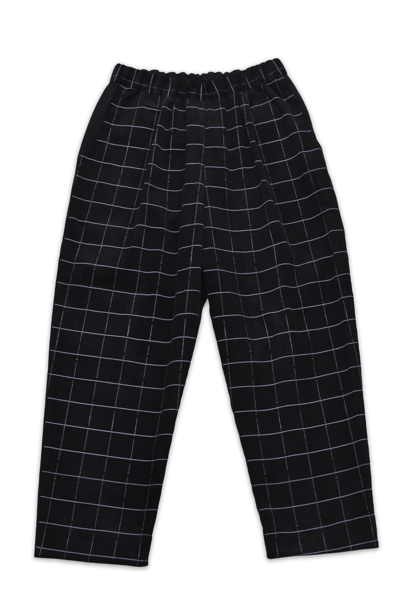 電線や電線を支える碍子(がいし)をイメージしたプリントを施した太畝コーデュロイを使ったパンツ。