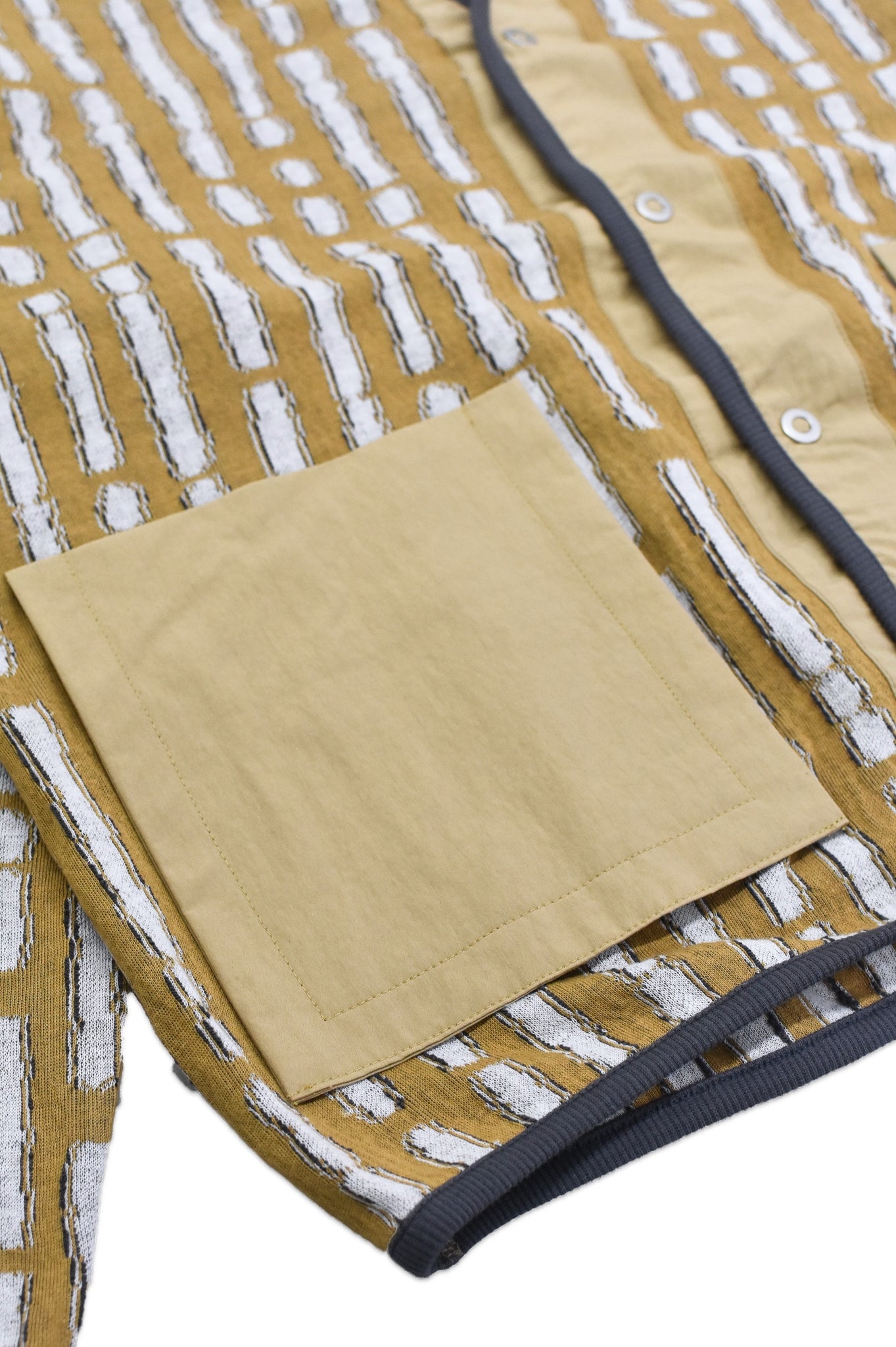 ニット生地は3層構造になっていて、内側に閉じ込められた中綿が部分的に表にのぞく立体感のあるテキスタイルです。