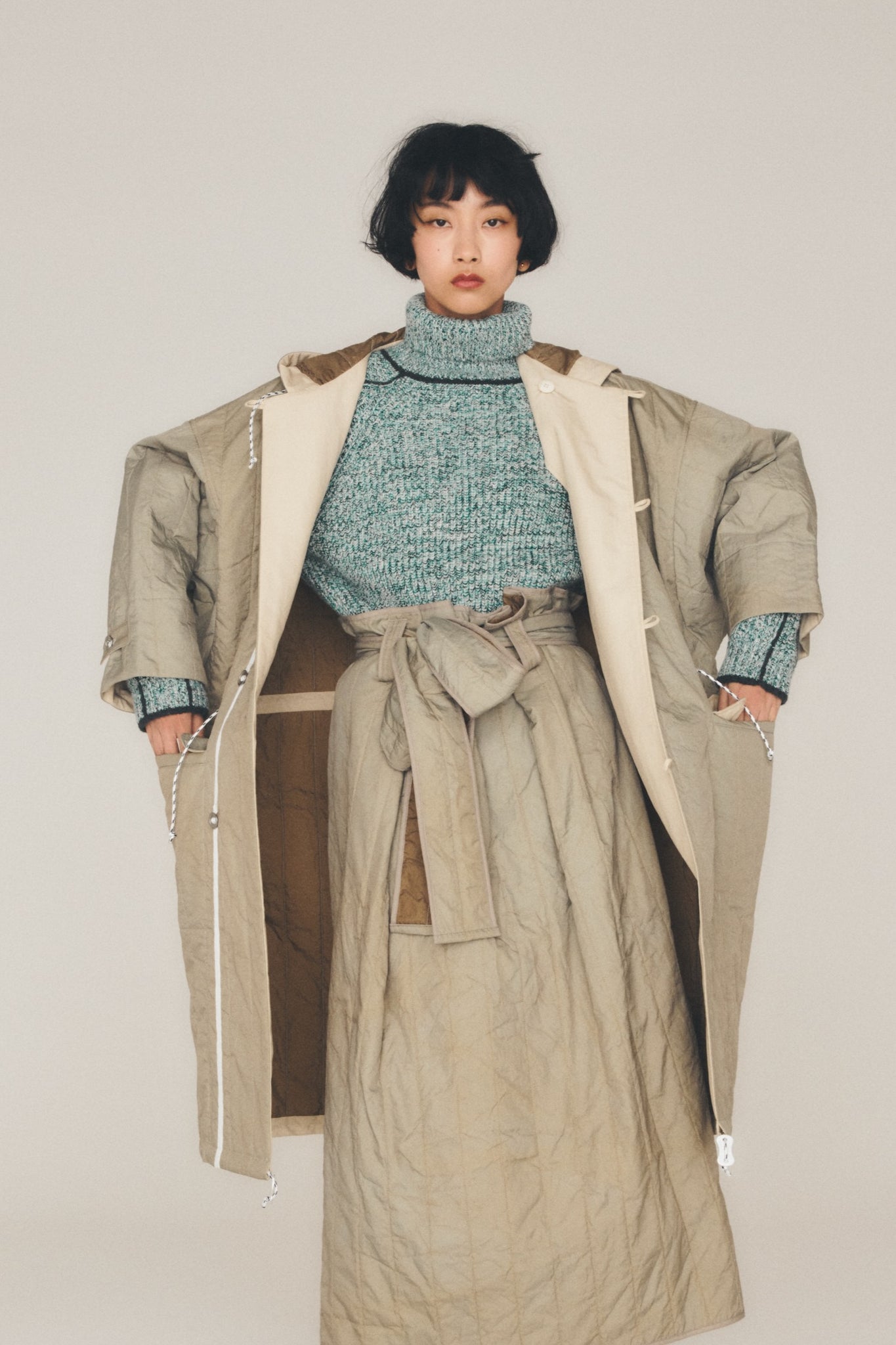キルティング生地は表裏色の違うナイロン生地を使っていてステッチ色はスモーキーな水色。加工によって色の濃淡、くったりしたシワが生まれていて、ニュアンスのあるテキスタイルです。