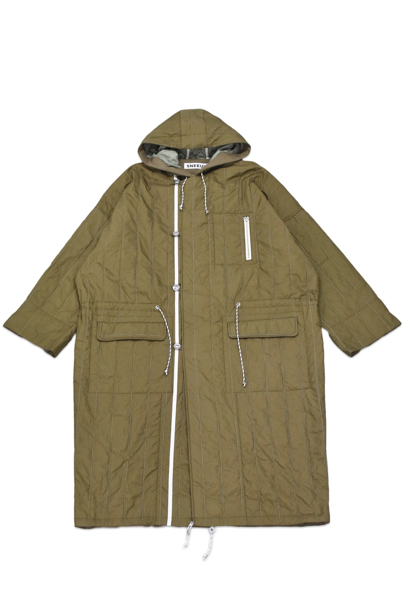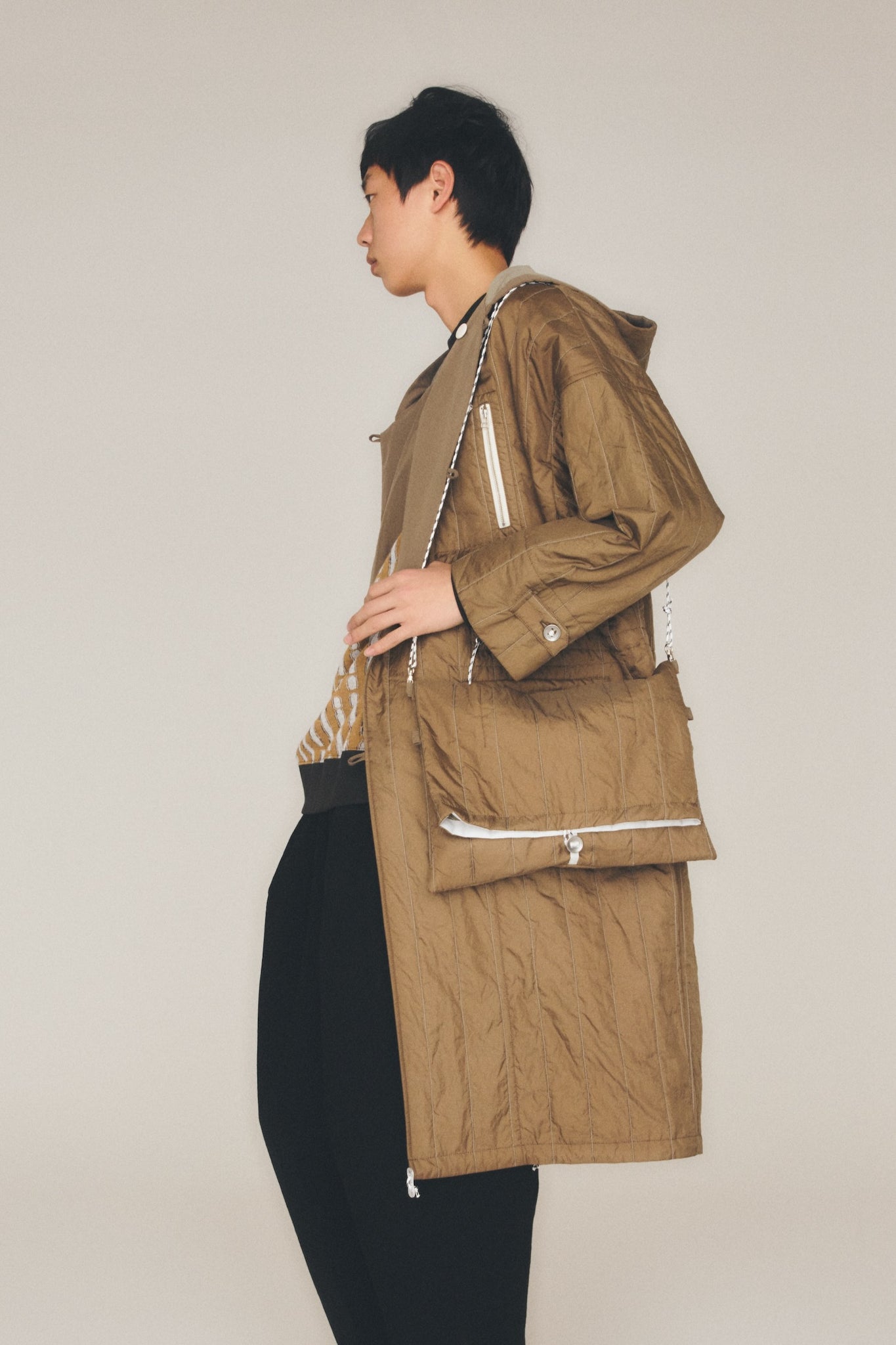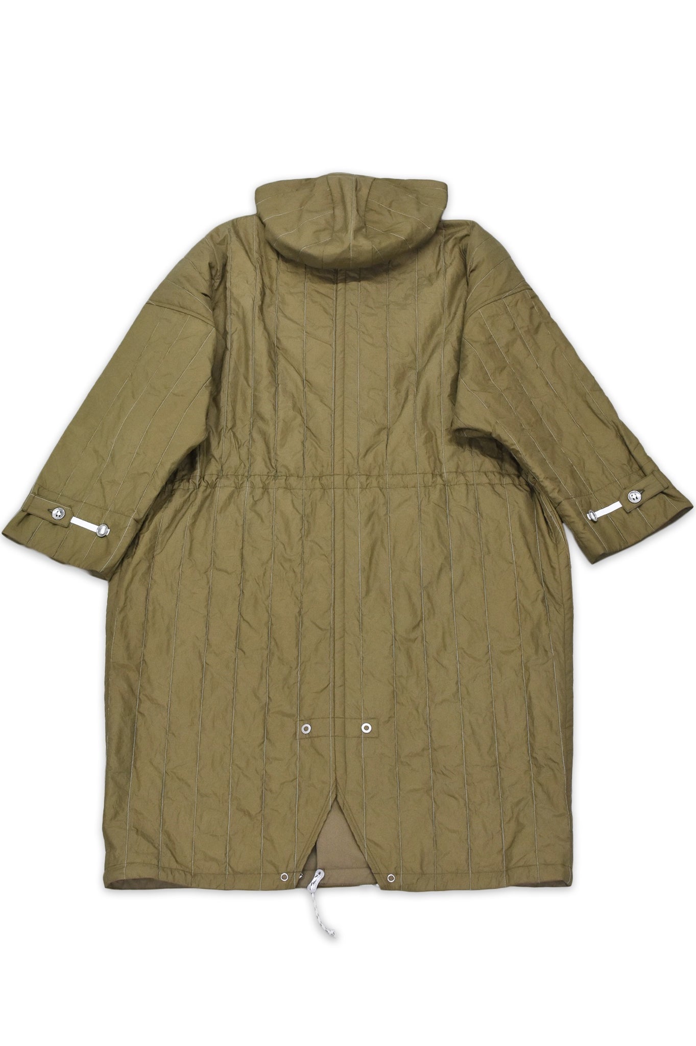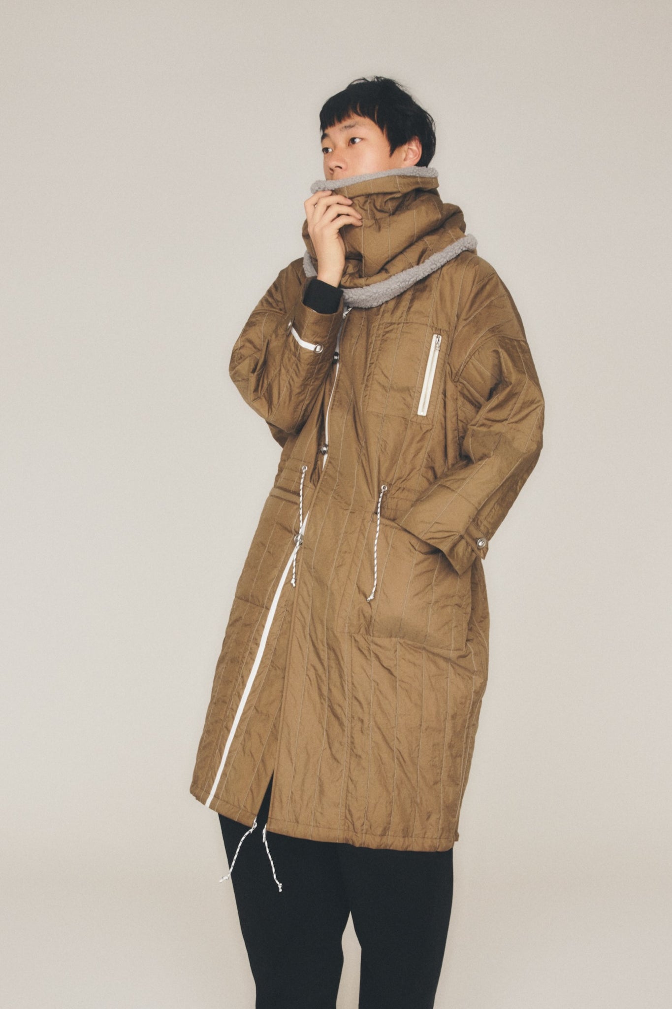 東炊きという江戸時代の染色方法を現代で再現した小さい釜を使って生地を柔らかく染め上げる手法で染められたオリジナルのキルティング生地を使ったモッズコート。