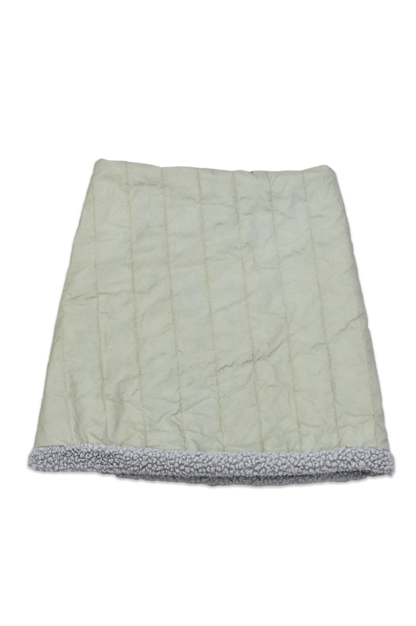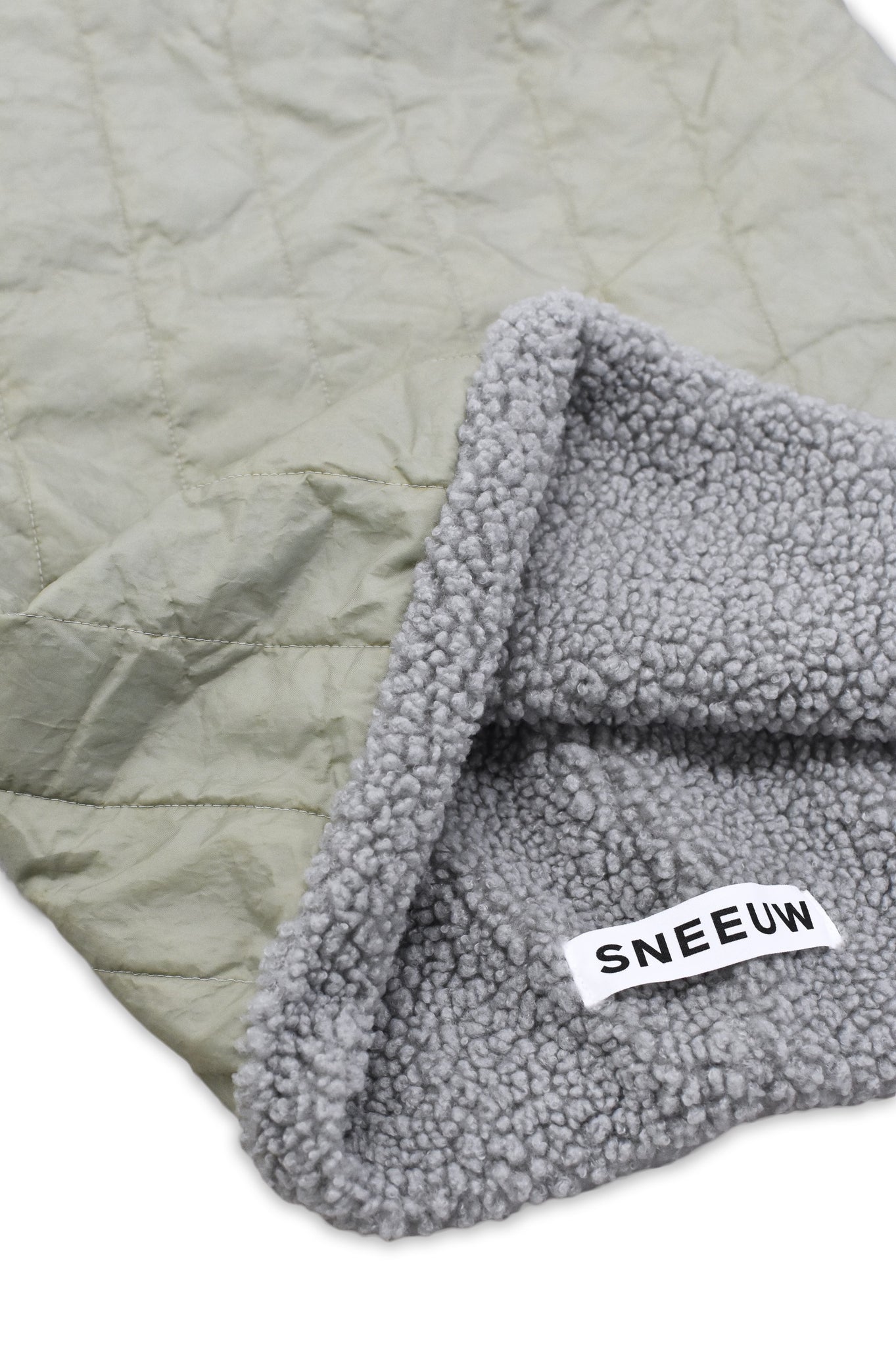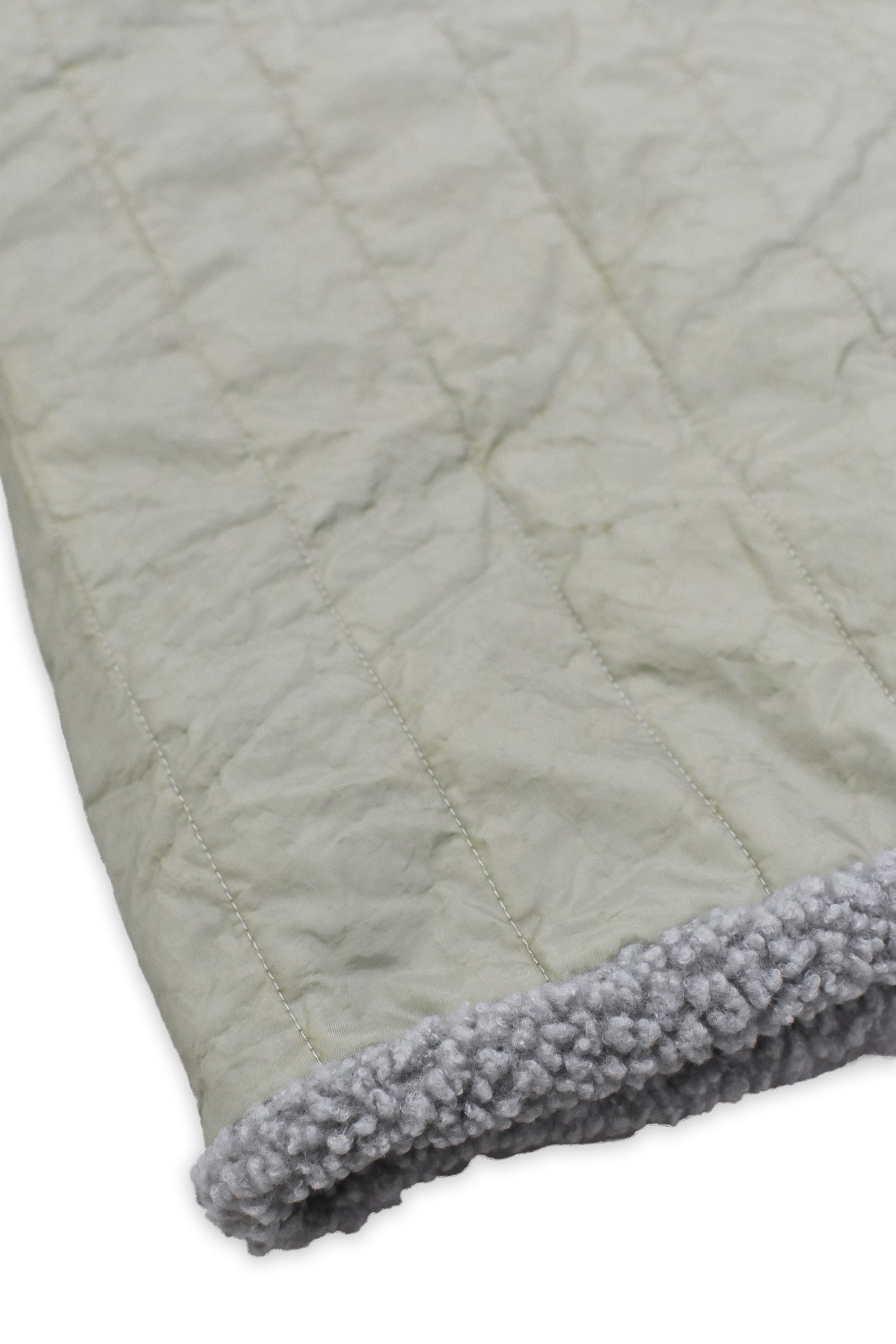 キルティング生地は表裏色の違うナイロン生地を使っていてステッチ色はスモーキーな水色。加工によって色の濃淡、くったりしたシワが生まれていて、ニュアンスのあるテキスタイルです。キルティングのグレーはグリーンがかった色味です。